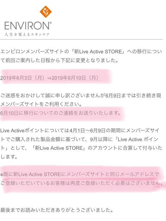 新Live Active store移行日変更のご案内 エンビロンについて -